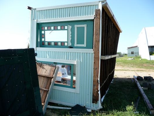 Once upon a time, when the models were in front and the Grand Opening was only days away: a tornado came to visit and knocked over 7 houses that I once thought would be very hard to do. Sadly it was broken but we were able to right and fix it, thus you see it 16 years later, still looing good, but a different window in the front where the roof from the porch went through.